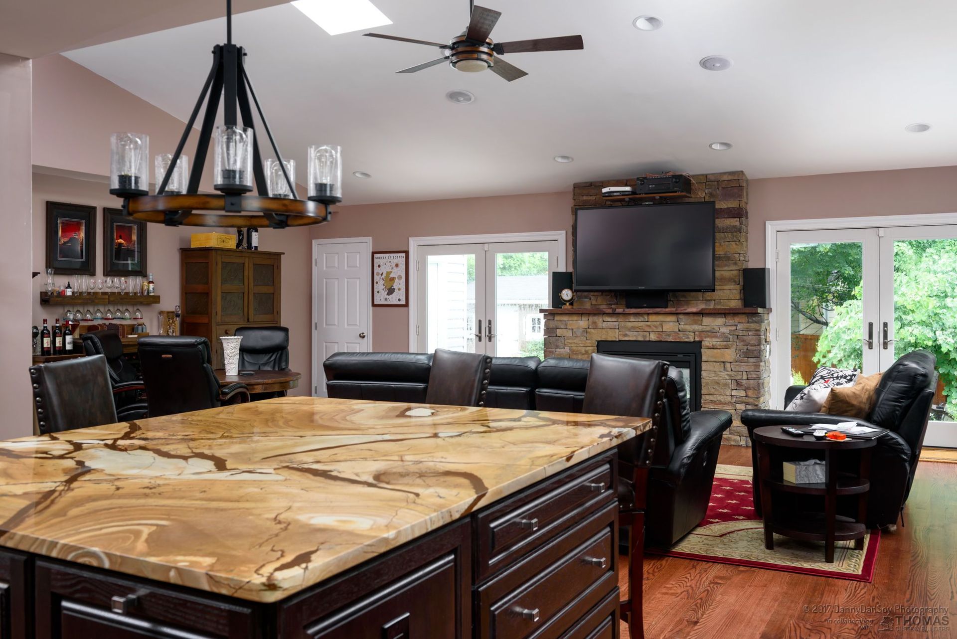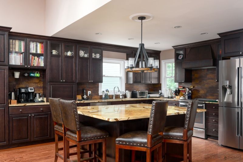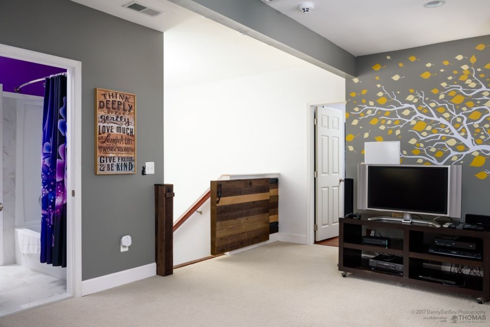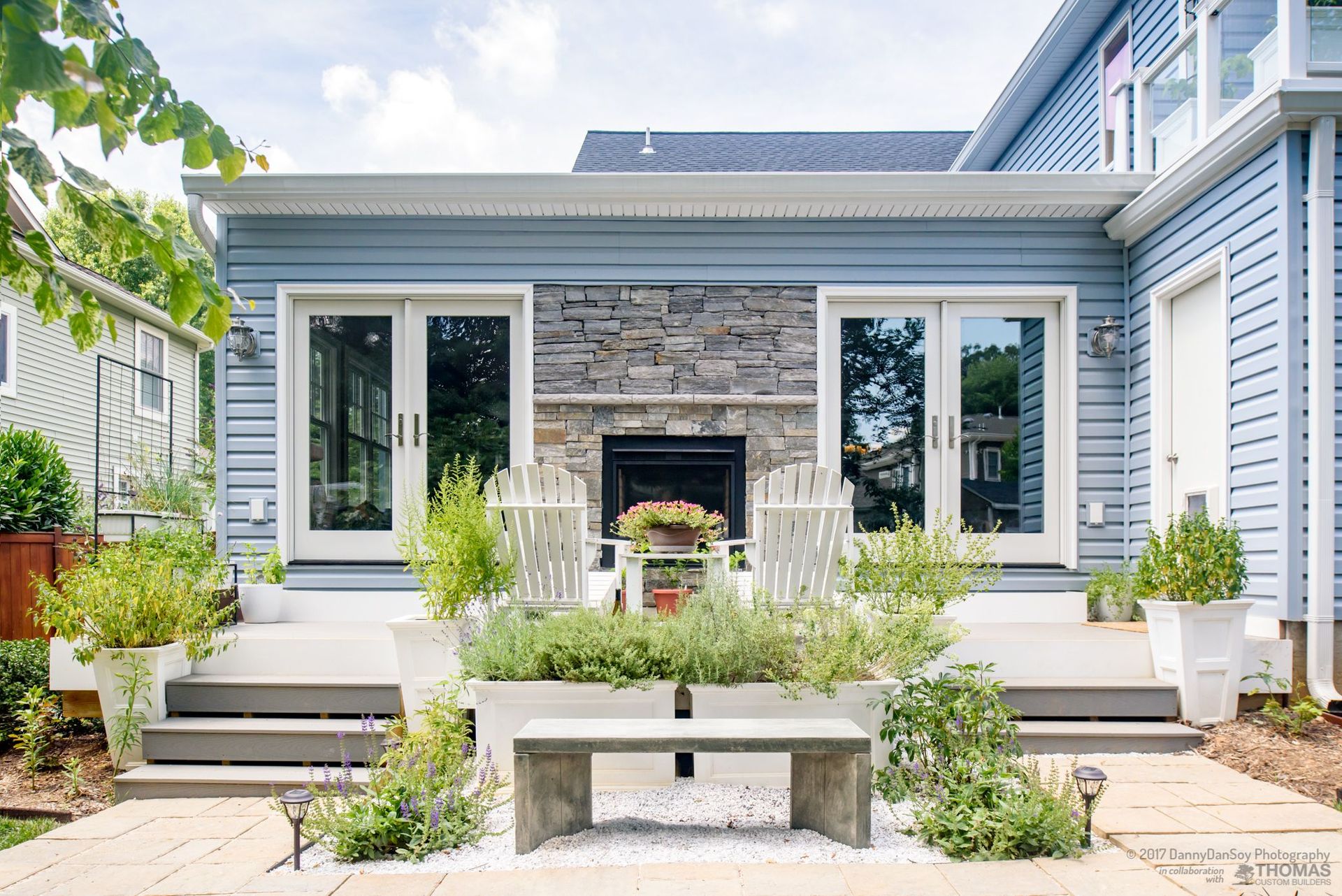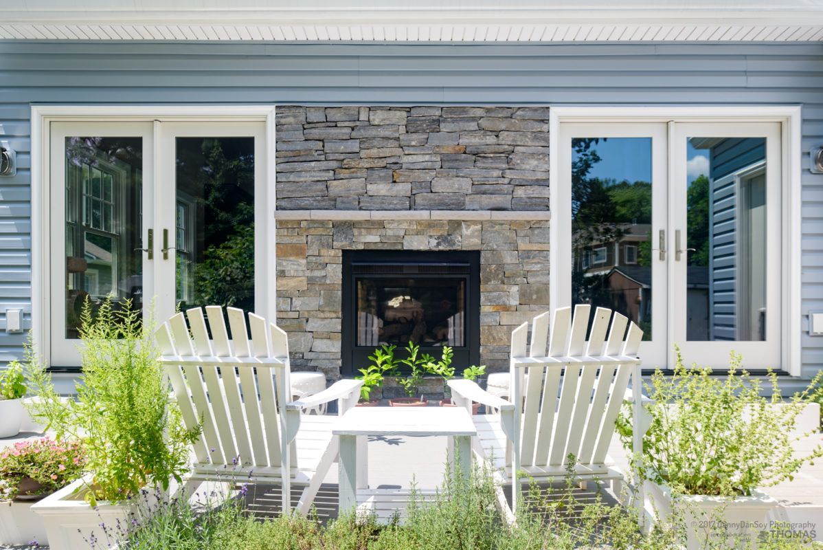 We completed a full second story addition and rear great room on this home in Falls Church, VA with a new master suite and two additional bedrooms and a master bath with wet room and an additional bath plus a playroom and laundry room. The addition was designed with a pitched roof allowing for a vaulted ceiling in the master bedroom and the new great room. The master bedroom opens to a second floor covered porch, complete with glass railing and lighted ceiling fan. The spa-like master bath features an oversized, free-standing tub with floor to ceiling slate stacked-stone backsplash. The curbless shower and wet room helps this modern bathroom feel light and airy. We also remodeled the gourmet first floor kitchen, which is anchored by this stunning granite island with seating for four. Custom Schrock cabinets and a dramatic tile backsplash make this oversized kitchen feel warm and cozy. In the great room, we added a two-sided fireplace for indoor/outdoor use. The incredible back patio is sure to be a gathering spot for this family for many years to come! At Thomas Custom Builders, we love the challenge of designing a second story addition. There’s an art to it, and it feels tremendously rewarding when you crack the code and, like in this home, the plan just “works.”