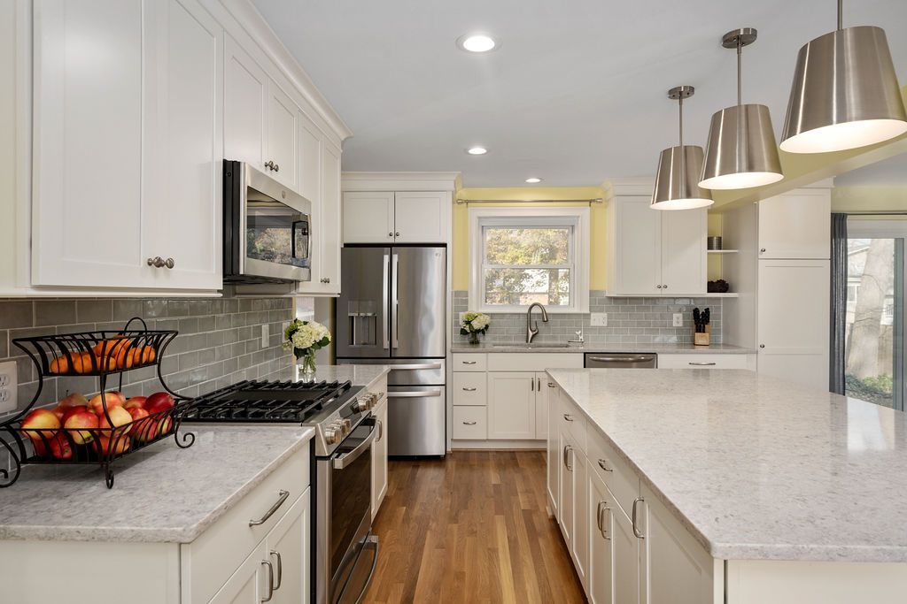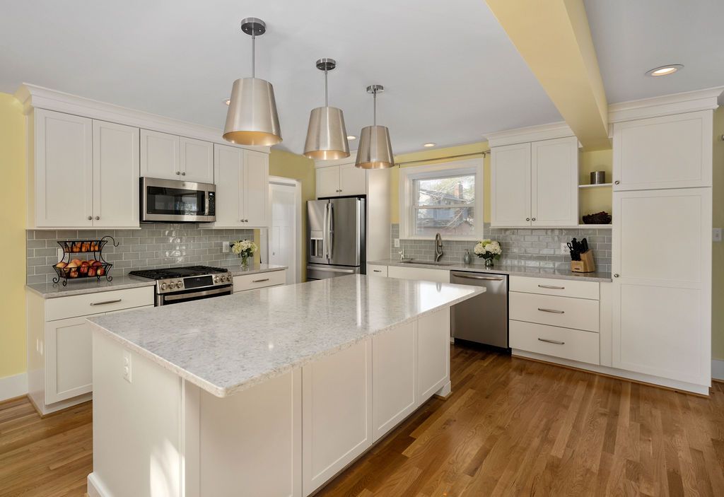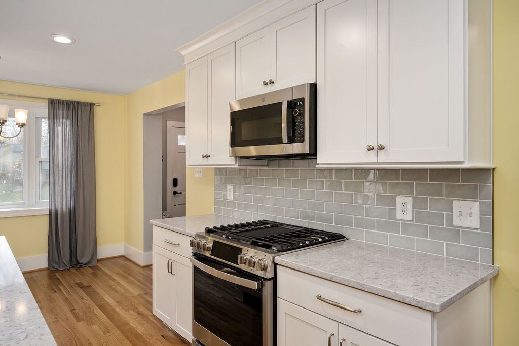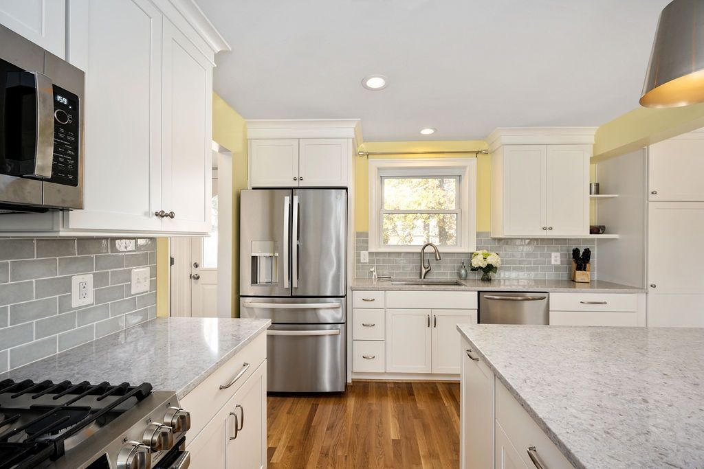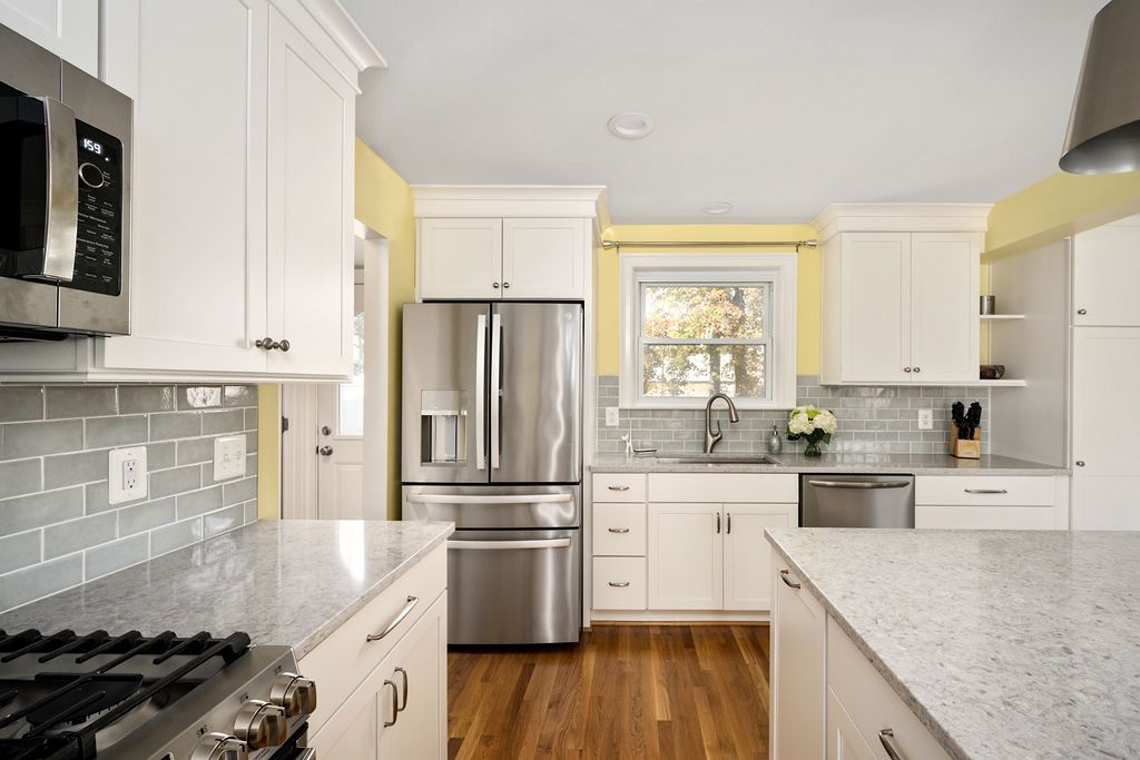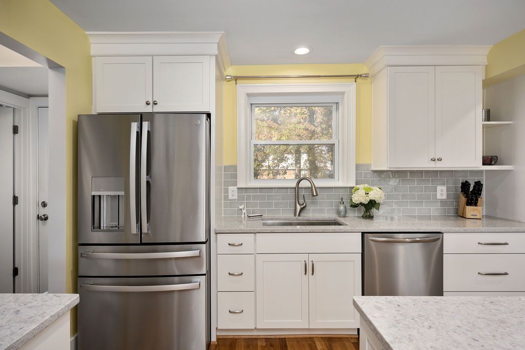 White shaker cabinets, neutral grey countertops and tile backsplash are the perfect accent to the sunny yellow wall color. This kitchen is sure to make you smile.