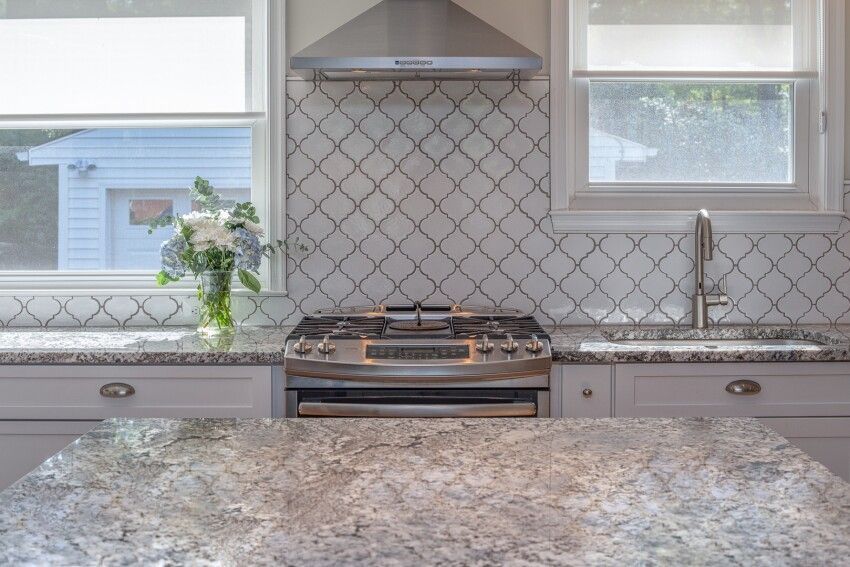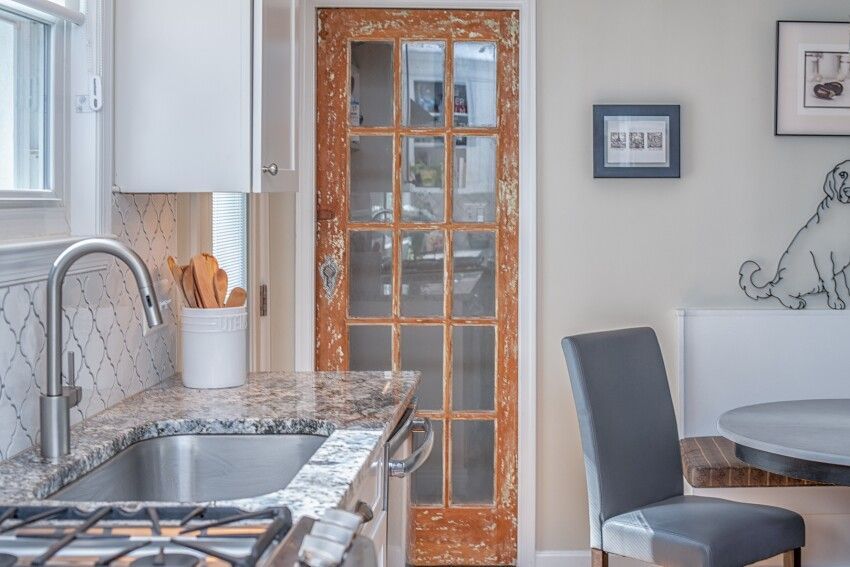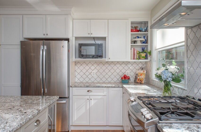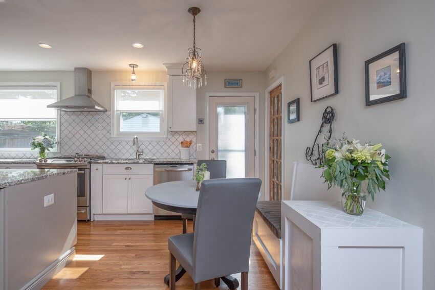 In this bungalow style home in Annandale, our homeowners wanted to update their kitchen and open it up to their living room. This also allowed for an increase in the footprint of the kitchen. Better organization, enhanced access for hard-to-reach areas, and increased functionality were key factors in the layout of the kitchen. The Schrock white maple shaker custom cabinetry includes wide drawers, base trash, pull-outs, cutlery space, and a corner lazy-susan. In addition to providing counter seating for two, the island provides double-sided storage as well as a spot for the wine fridge. The custom built-in bench with tile topped side table becomes the perfect drop zone for keys and electronics. From a design standpoint, the goal was to retain antique charm while mixing in clean lines and simple styling. This cozy kitchen pairs whites and off-whites with light-gray colors and elegant embellishments. The simplicity of this light color palette compliments other colors used in the home as well as the more decorative details such as the patterned, gray granite countertops, Whisper White Arabesque tile backsplash with gray grout,, antique chandelier light fixture and charming distressed pantry door. This modern cottage kitchen proves renovating a small space can still have a big (and stylish) impact!