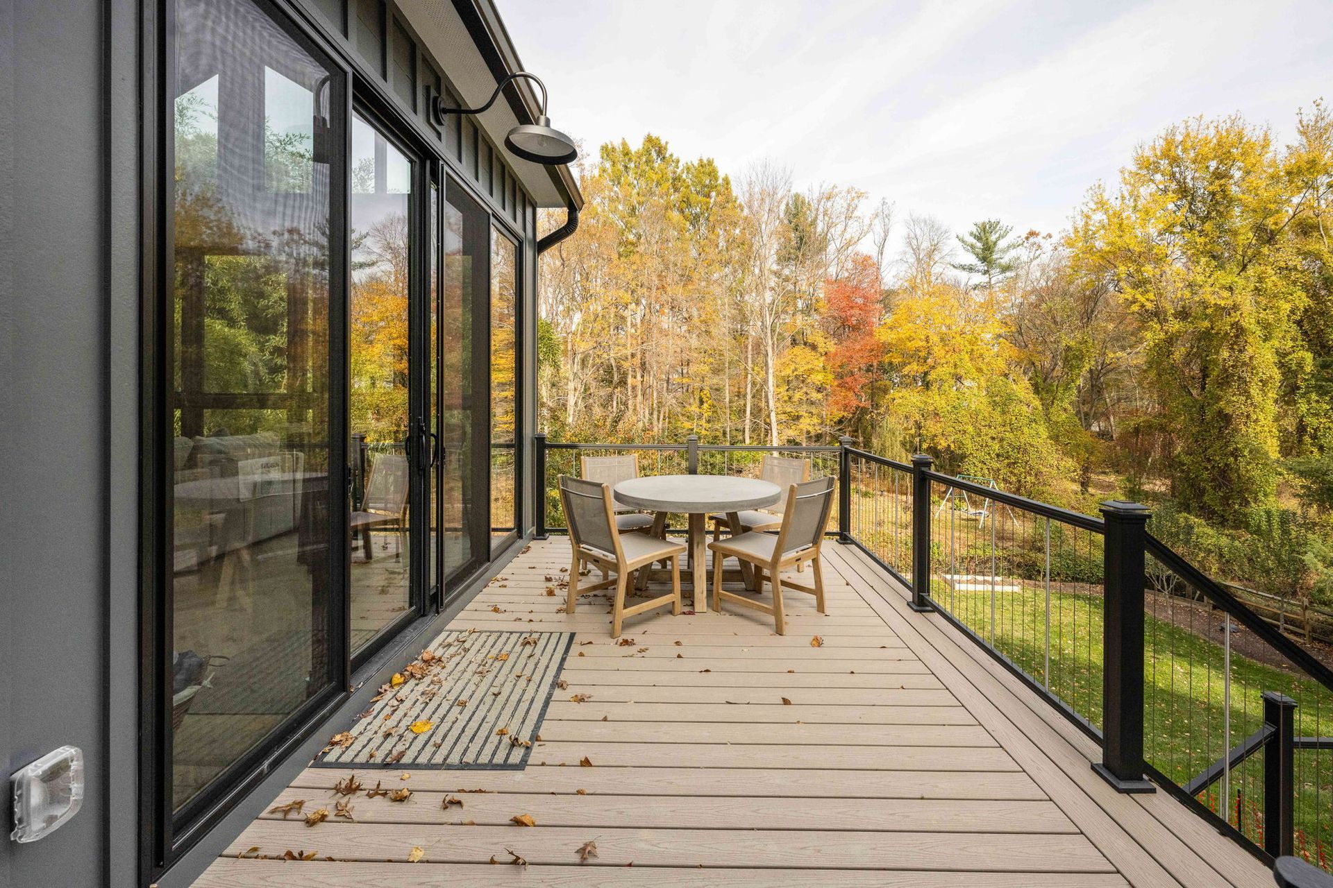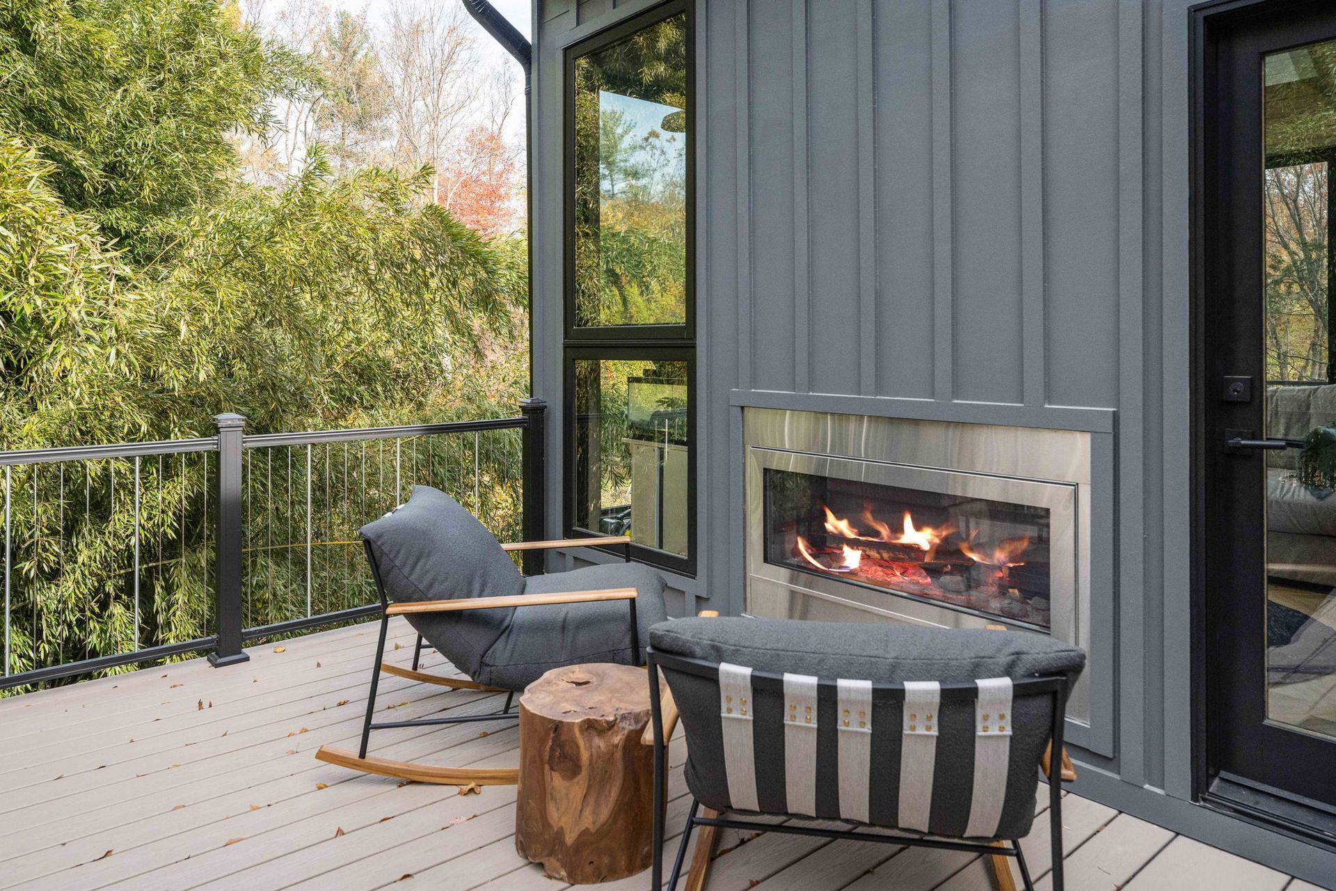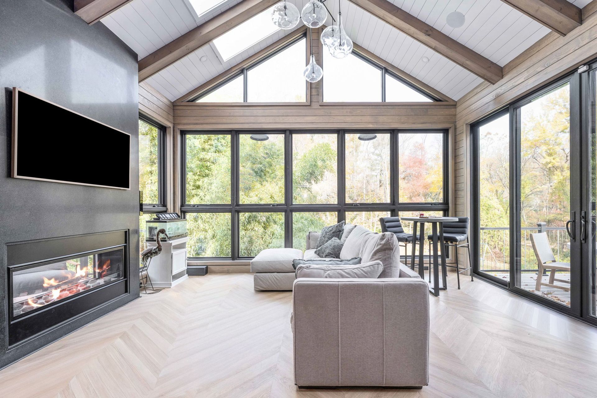 We absolutely love how this four seasons addition turned out! Our homeowners in Annandale wanted a stylish, contemporary indoor outdoor space for relaxing and entertaining. From the floor to ceiling window, beamed cathedral ceiling, double-sided slate fireplace and Trex deck with cable railing, the space turned out beautifully.