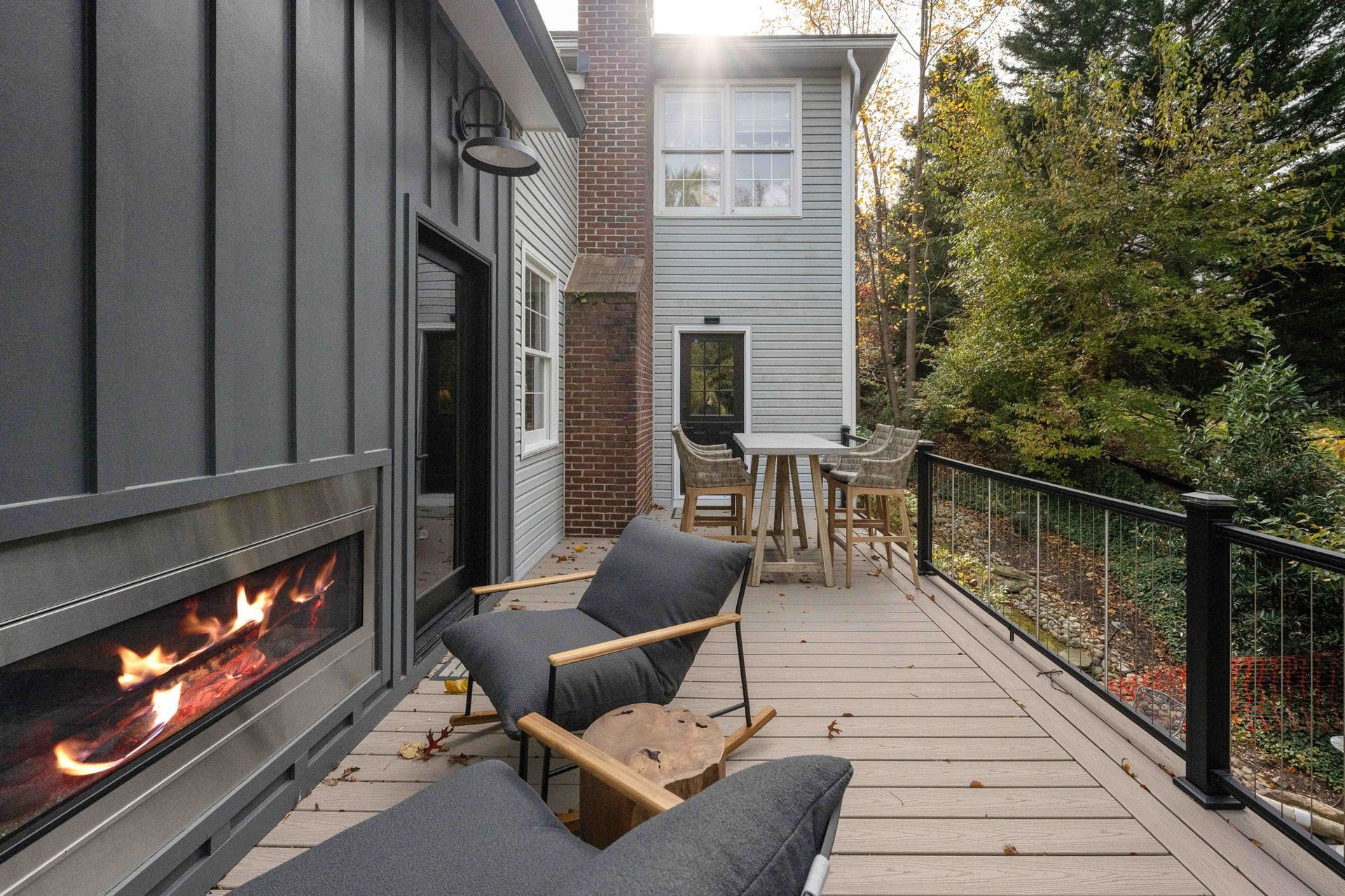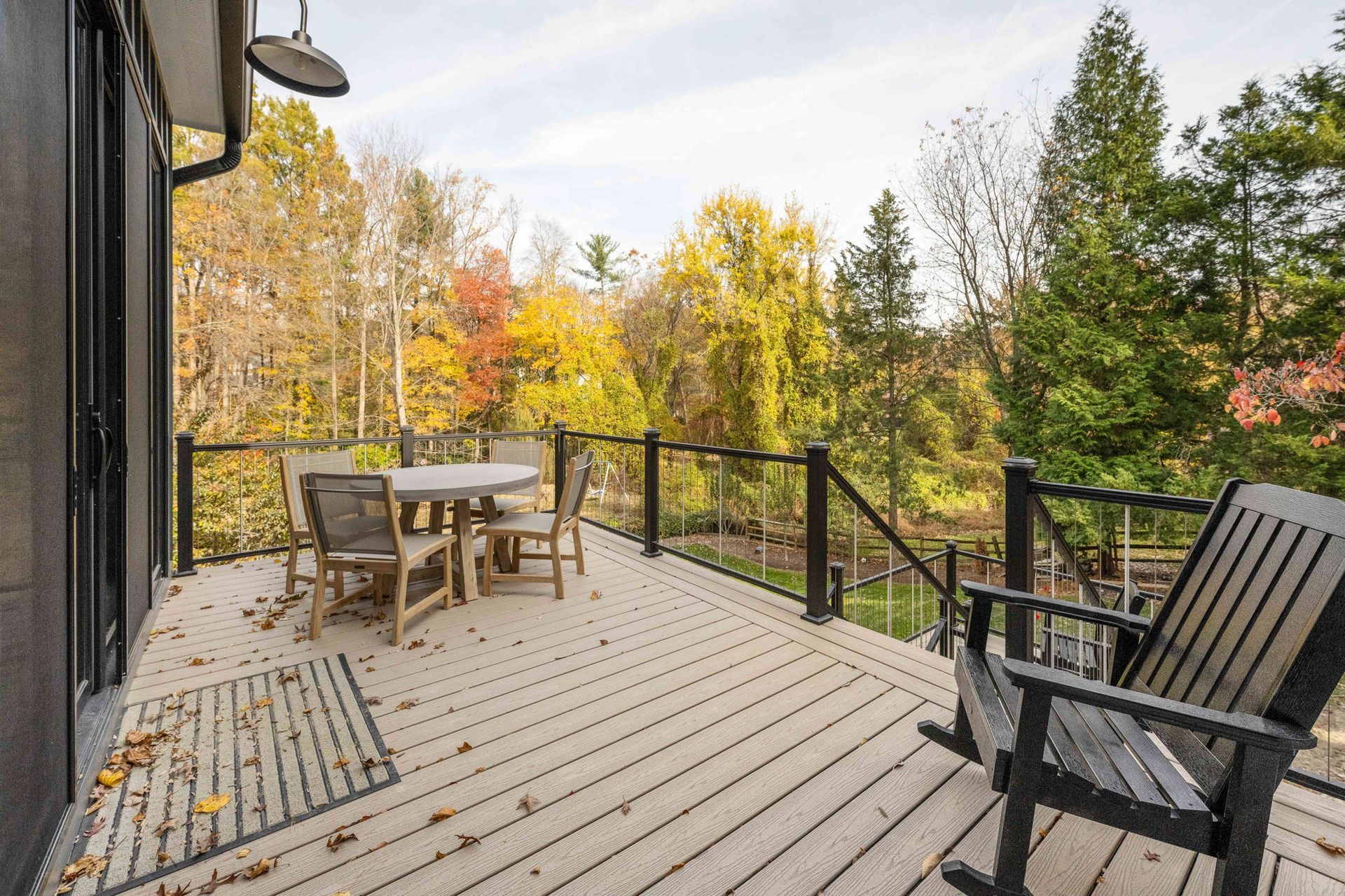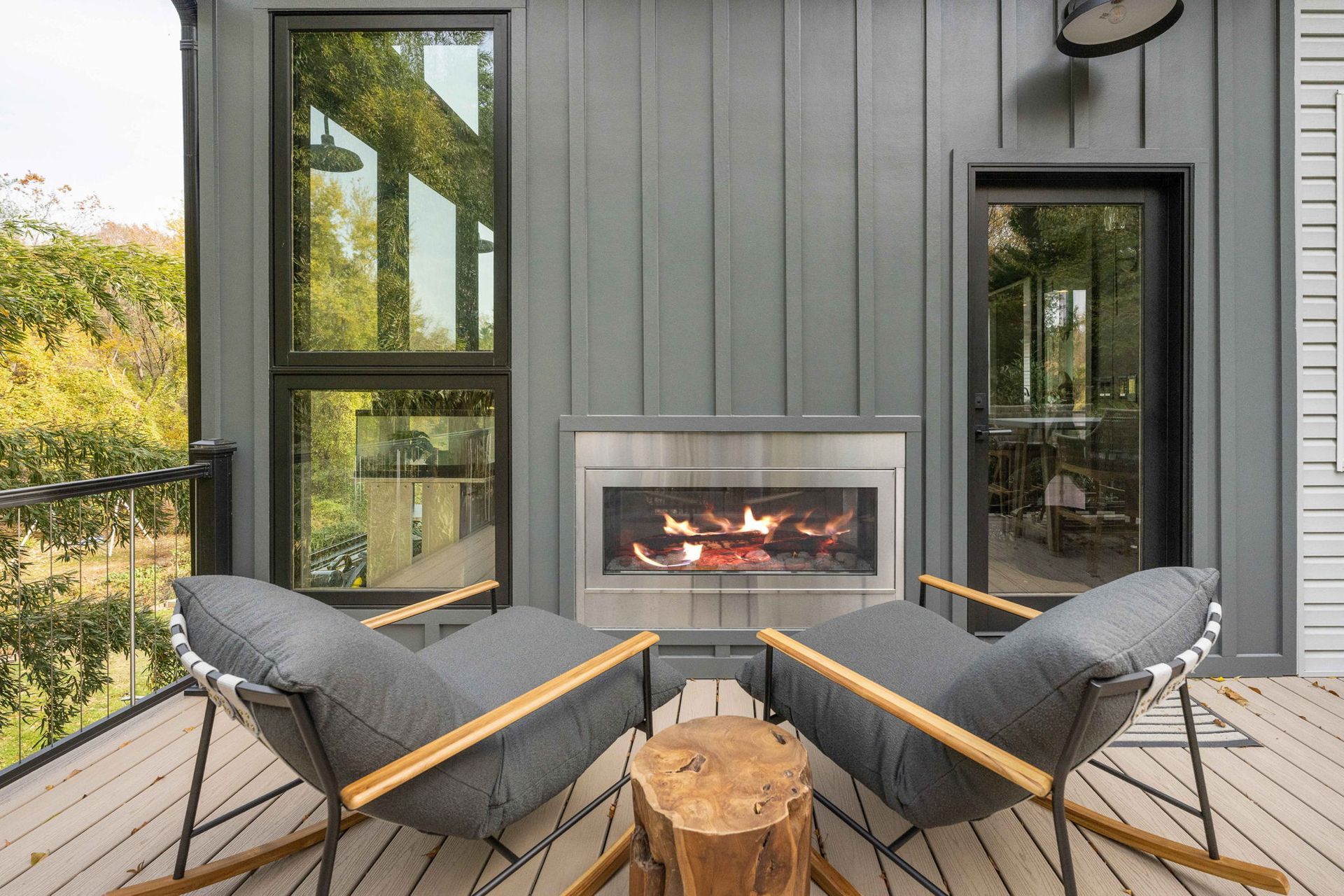 We absolutely love how this four seasons addition turned out! Our homeowners in Annandale wanted a stylish, contemporary indoor outdoor space for relaxing and entertaining. From the floor to ceiling window, beamed cathedral ceiling, double-sided slate fireplace and Trex deck with cable railing, the space turned out beautifully.