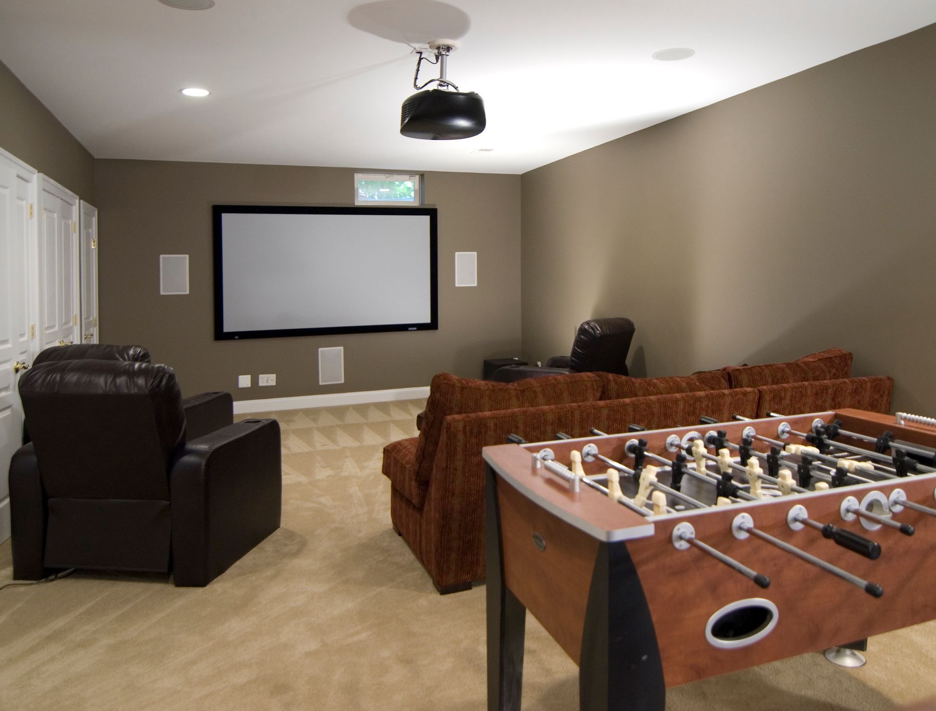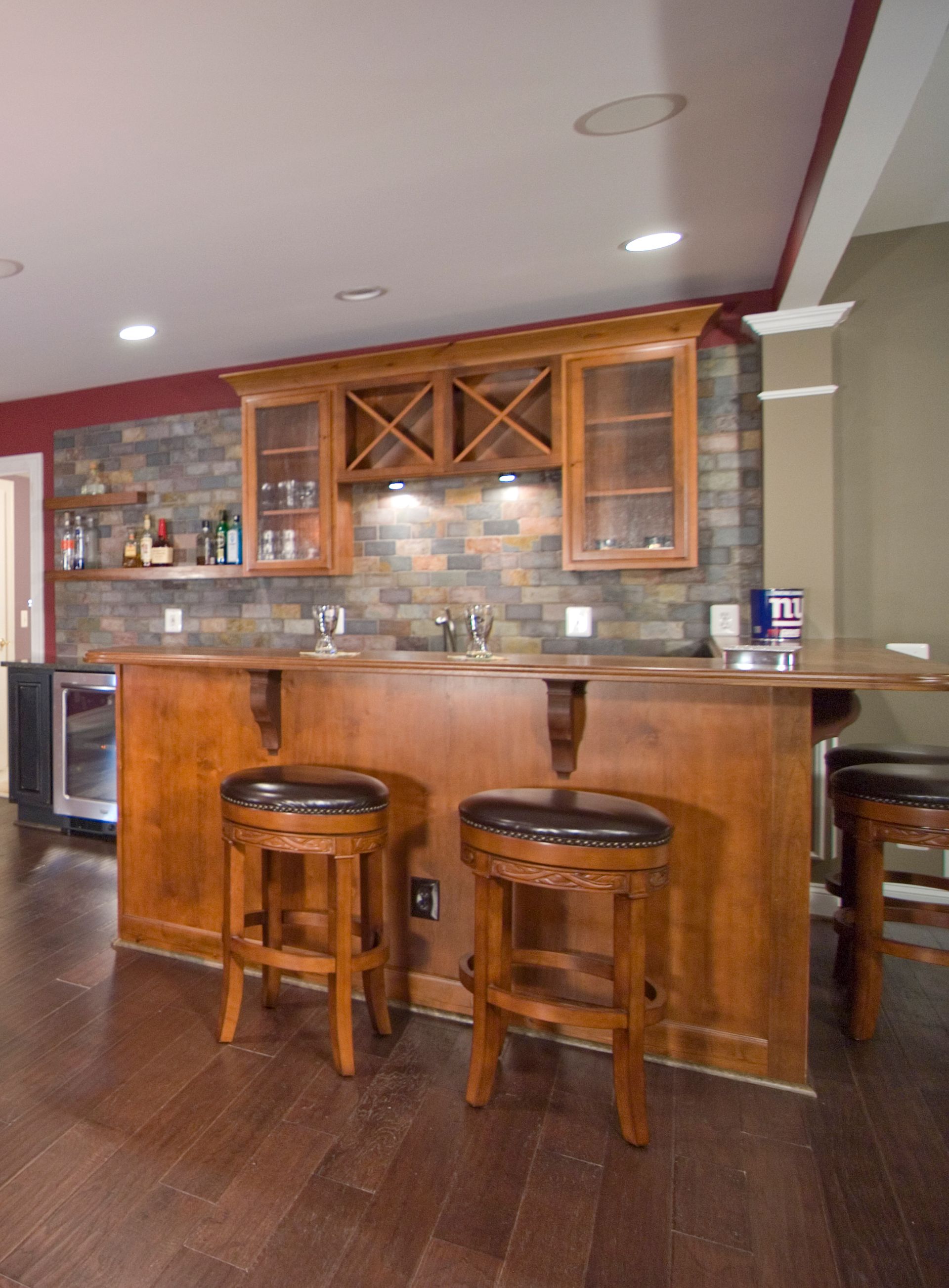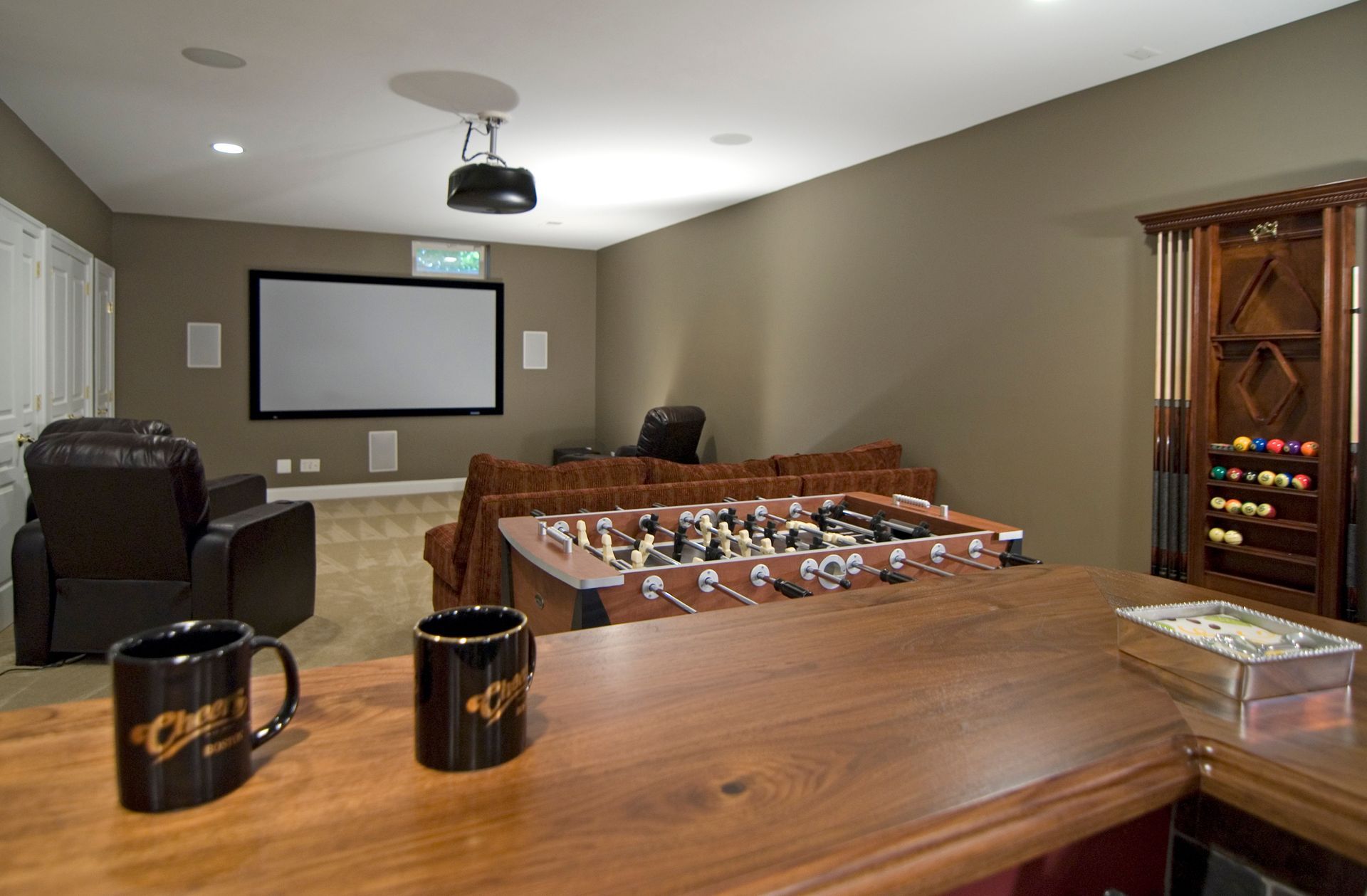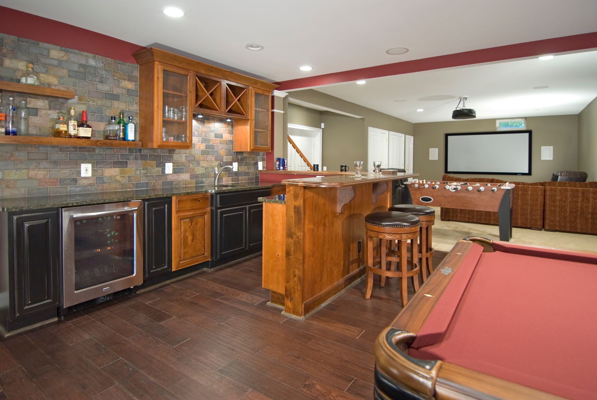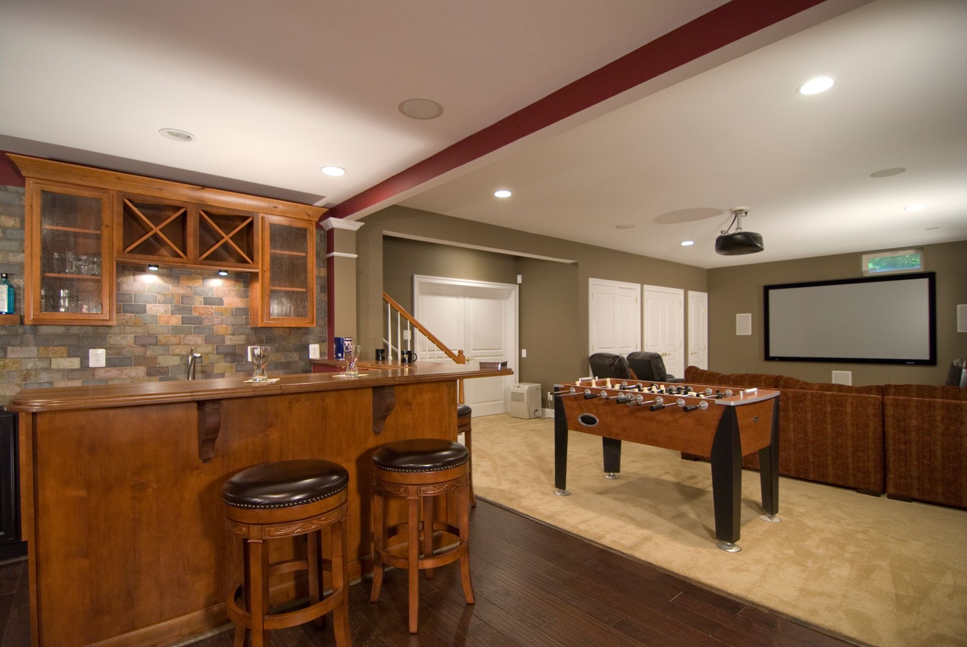 Our Oakton homeowners wanted to create a space for family and friends to relax and spend time together. Mission accomplished. This unfinished basement has been transformed into an entertainers dream. The built-in wet bar, projection television, pool table and foosball table all add up to hours of enjoyment.