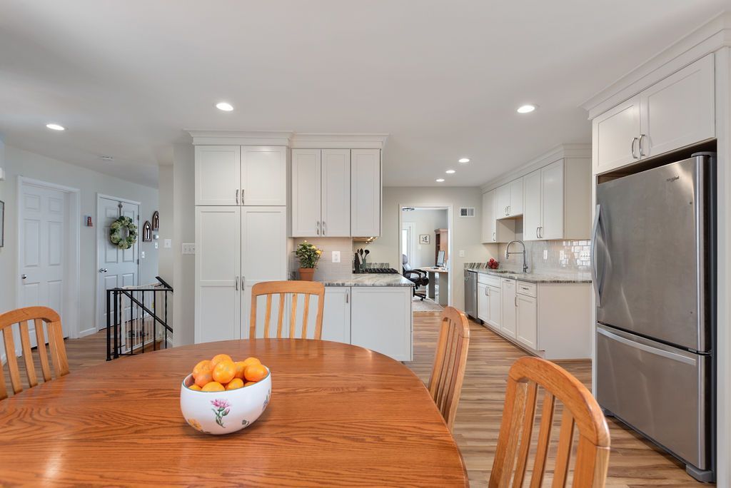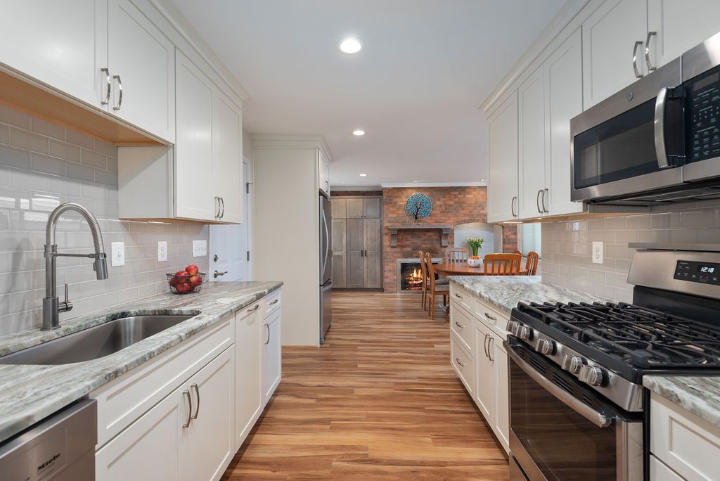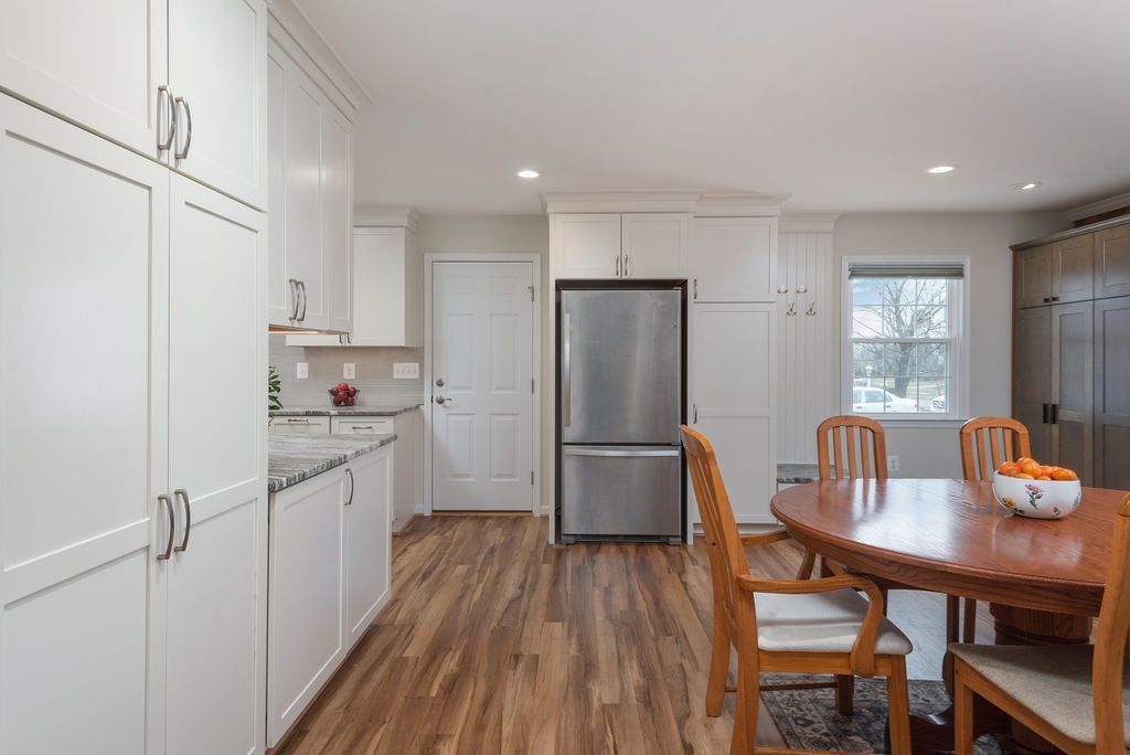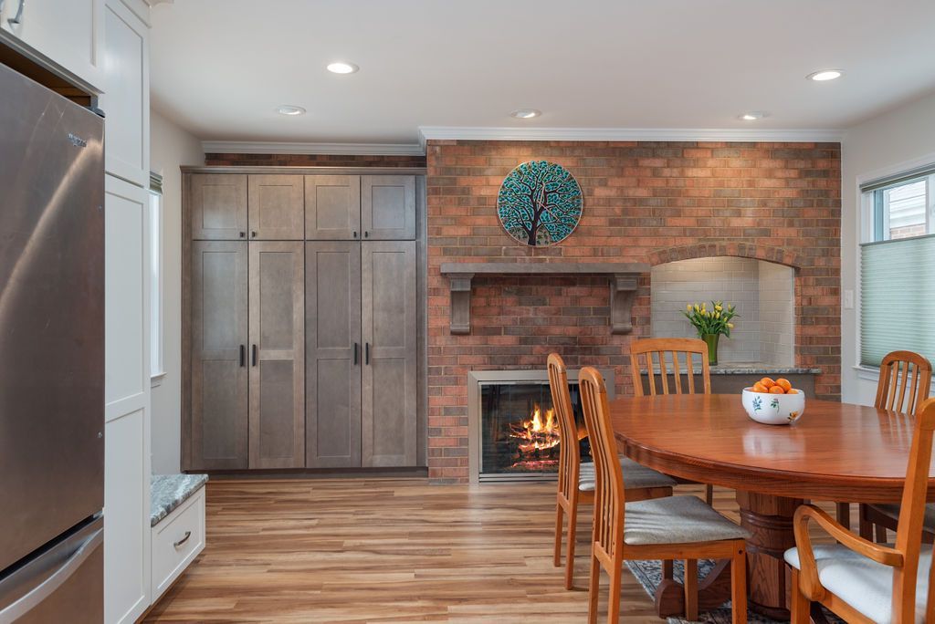 In the kitchen, the goal was to create a more open layout for the growing family. White shaker painted white custom cabinets helped to transform this dated kitchen. The grey, leathered granite countertop offers style and a unique textured finish. For the full backsplash, 3 x 6 grey ceramic pumice tile was selected. A freestanding cabinet with bench houses the refrigerator and serves as a utility closet and drop zone. A pantry was created next to the existing fireplace with a custom broad shaker maple morel built-in cabinet.