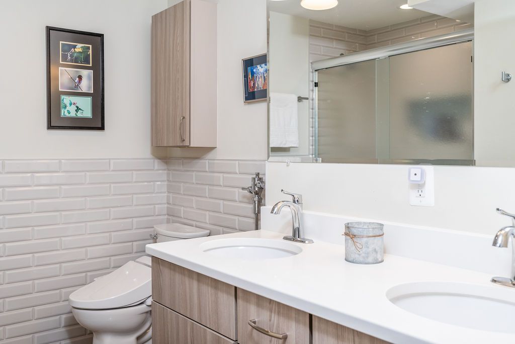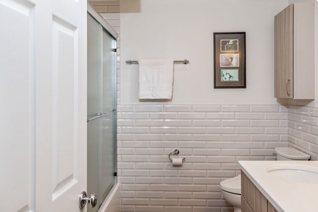 Next, we reconfigured the basement to add a bedroom and remodeled the existing bathroom. Custom maple wood grain cabinets were selected for the vanity and wall cabinet. An artic White quartz countertop with 4" backsplash, under-mount white sink and polished chrome fixtures compliment this neutral palette. For the wainscoting wall and tub tile 3 x 12 beveled light grey "mist" tile was chosen with a custom glass tub enclosure. Polished grey 12 x 24 plank floor tiles brings the whole look together.