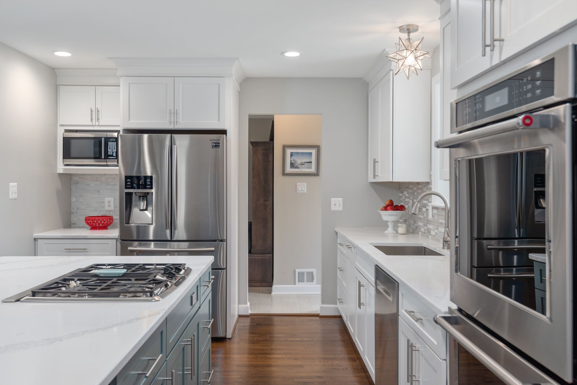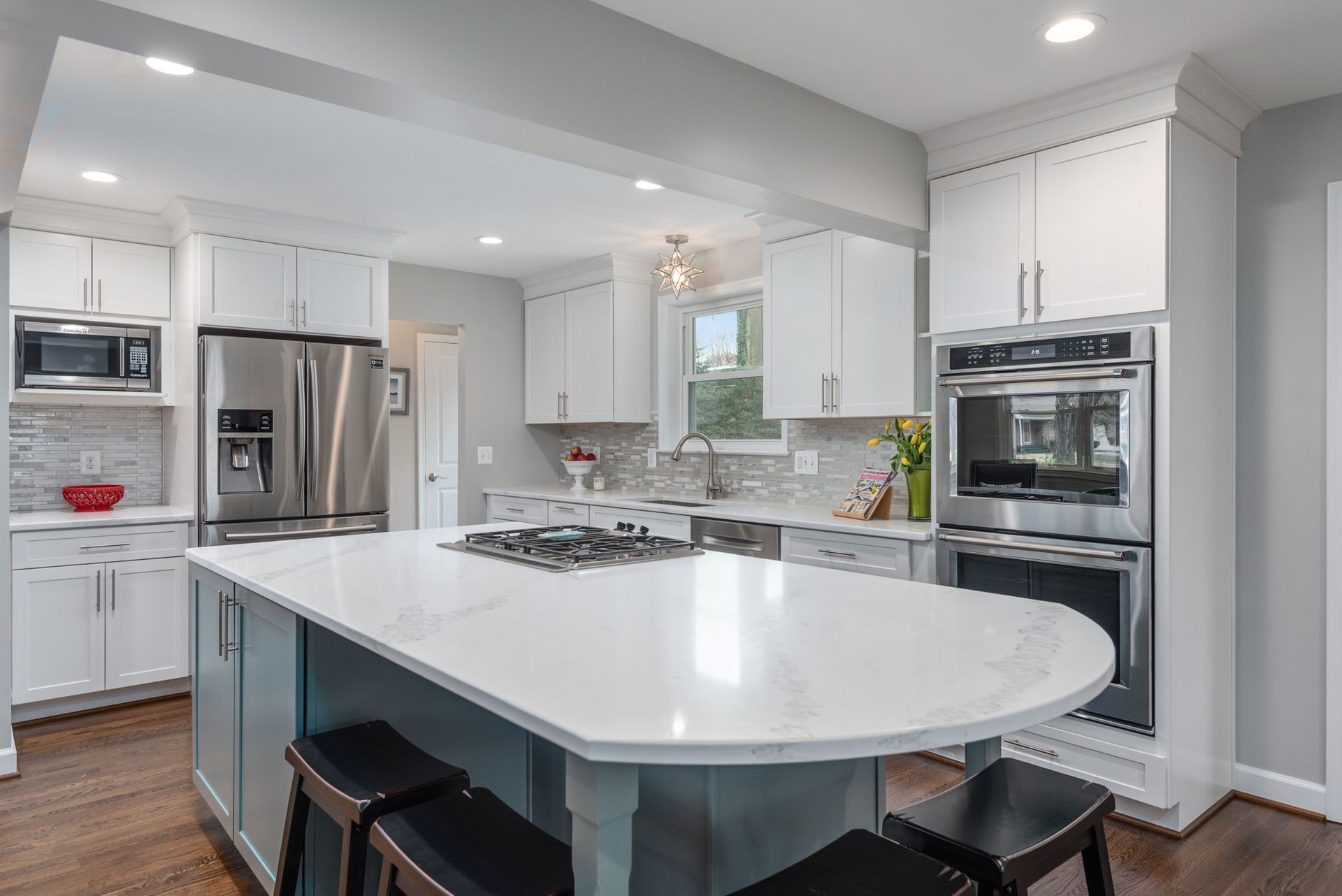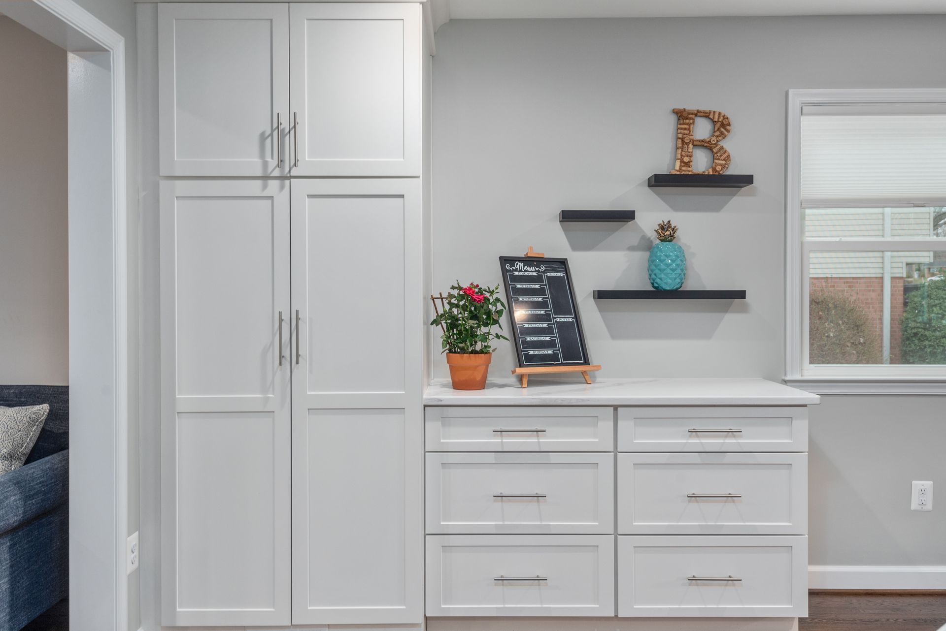 The transitional kitchen is now the heart of the home. The oversized, Seaside Blue island is the true focal point of the room. Schrock white shaker custom cabinets surround the perimeter with a quartz Calacatta Venice countertop throughout. The glass and marble mosaic backsplash ties everything together. The reach-in pantry and drop zone provide extra storage for the family.