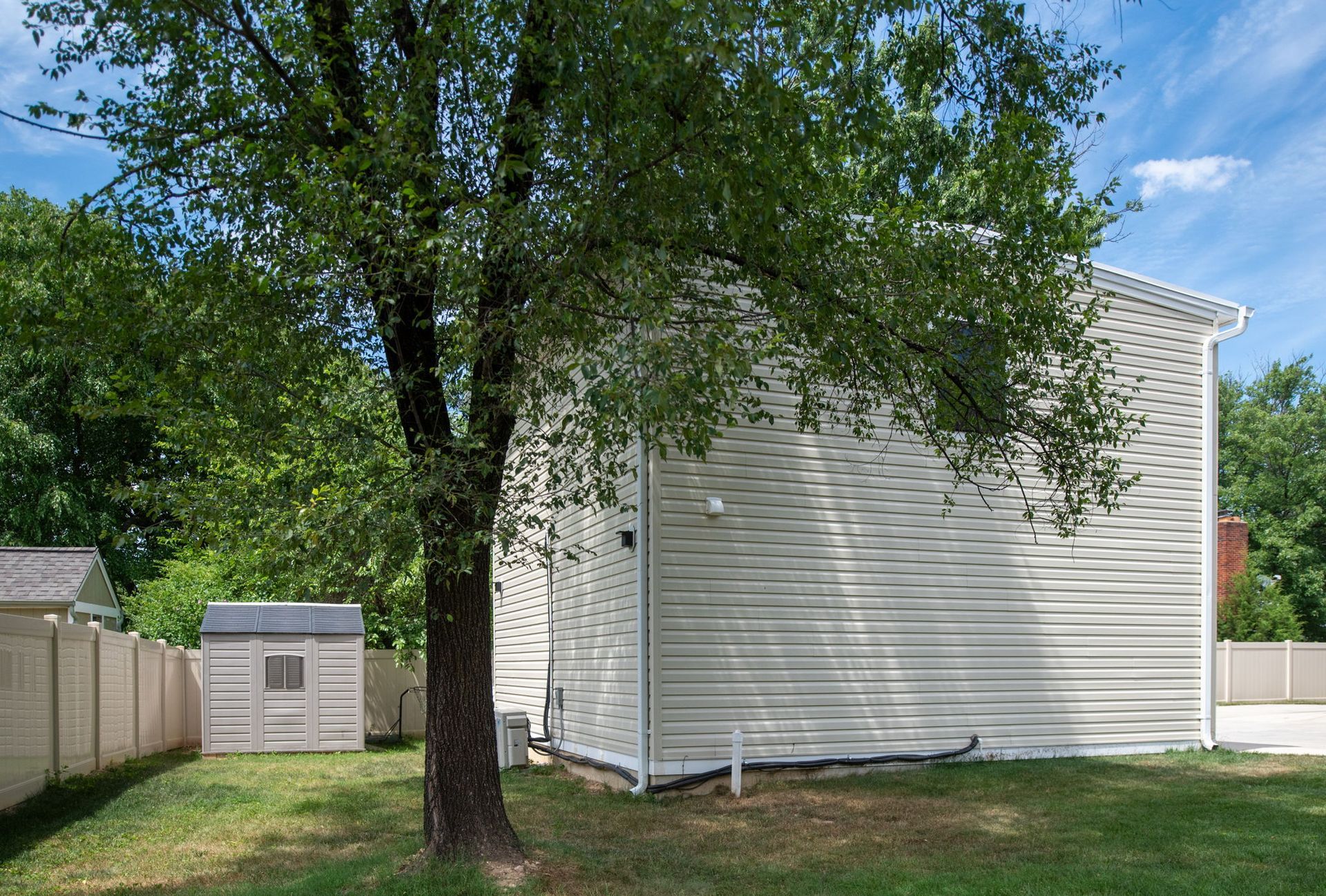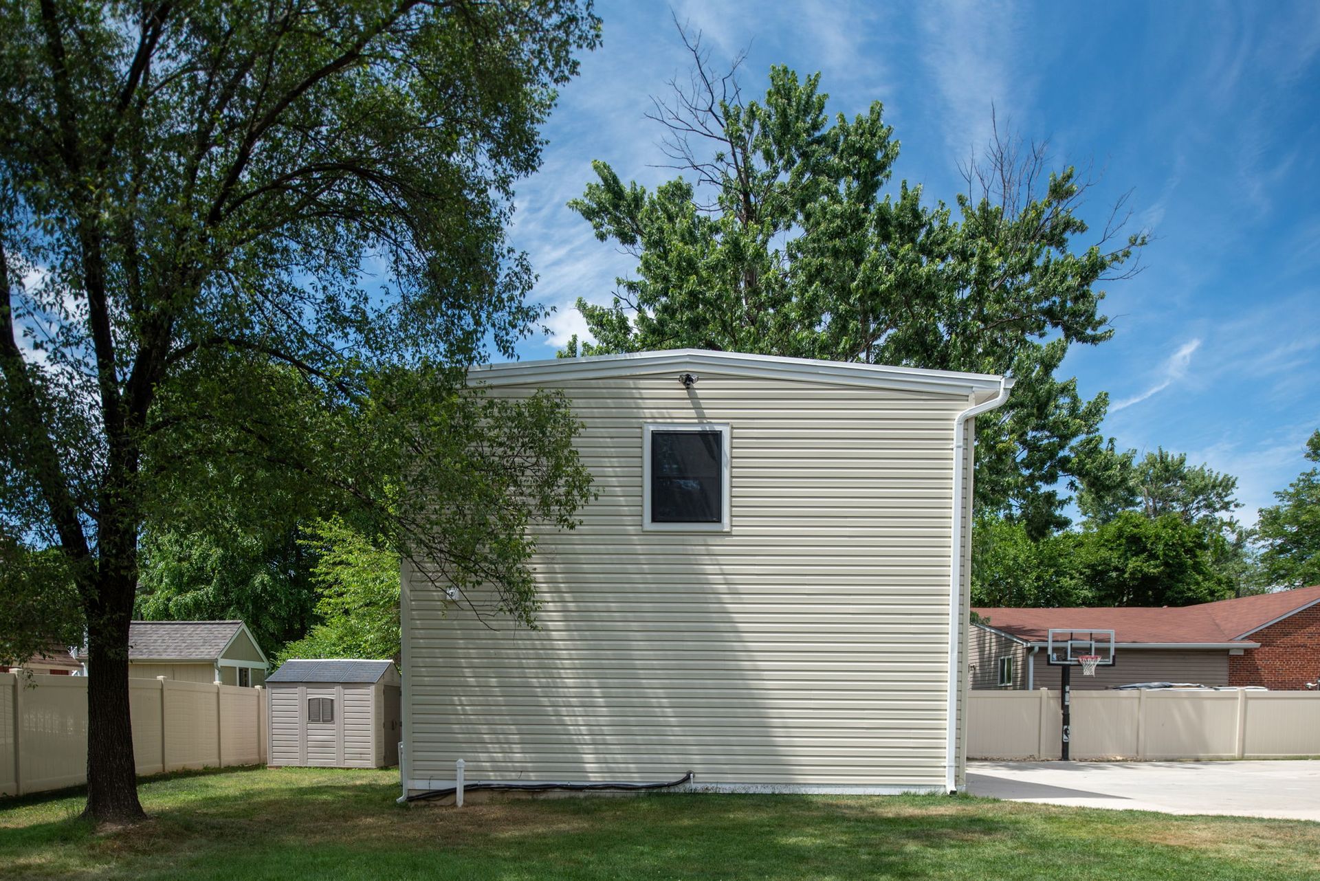 This task proved to be a bit of a challenge due to the level of the existing driveway. We got to work building up the foundation and adding utilities. Once the structure was in place, we finished the exterior with siding, windows and lighting. The real fun came on the interior, though. A chevron luxury vinyl floor, paneled walls and dark paint on both the ceiling and walls make this a sophisticated space for enjoying cocktails with friends or a movie with the family.