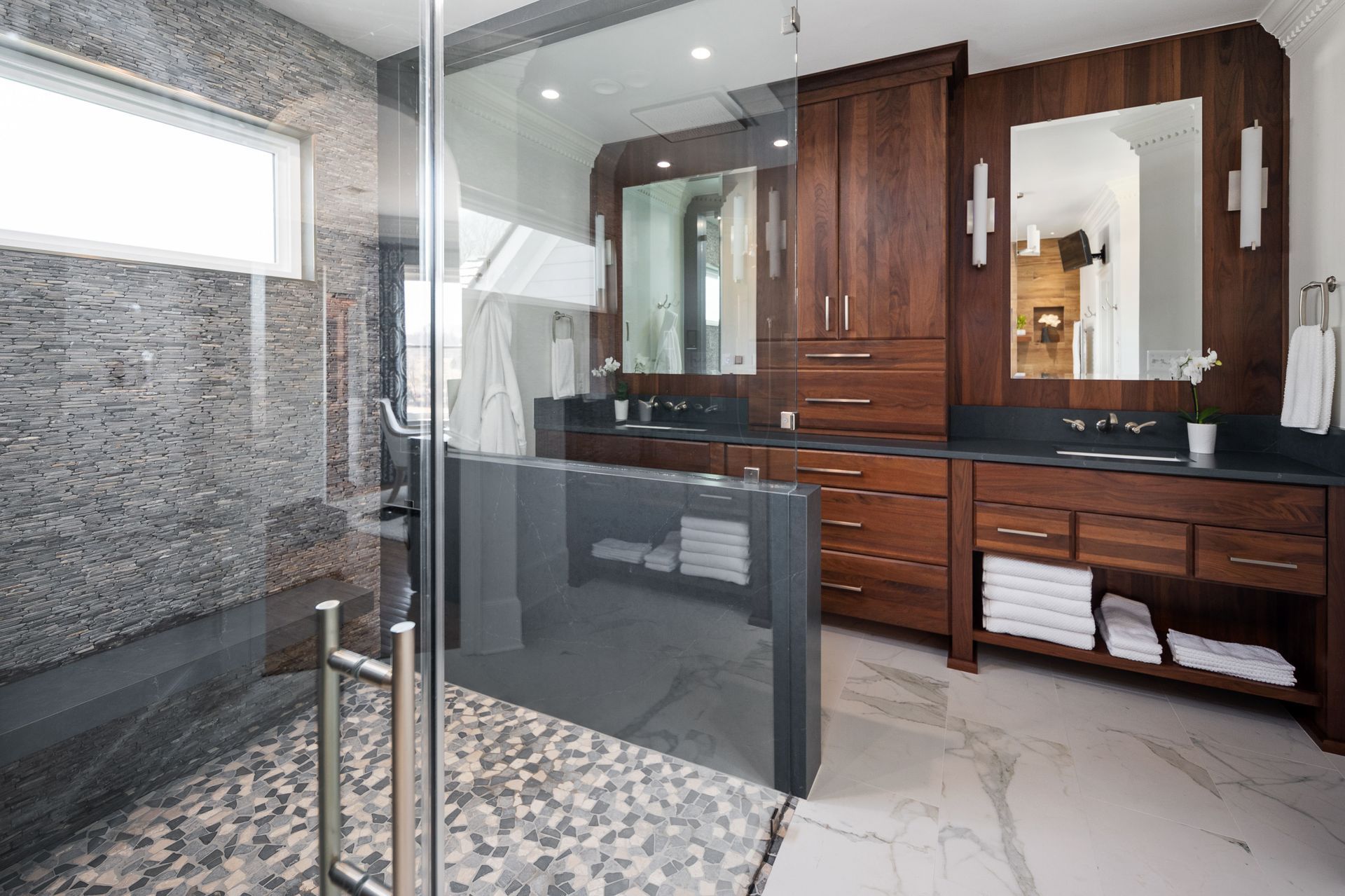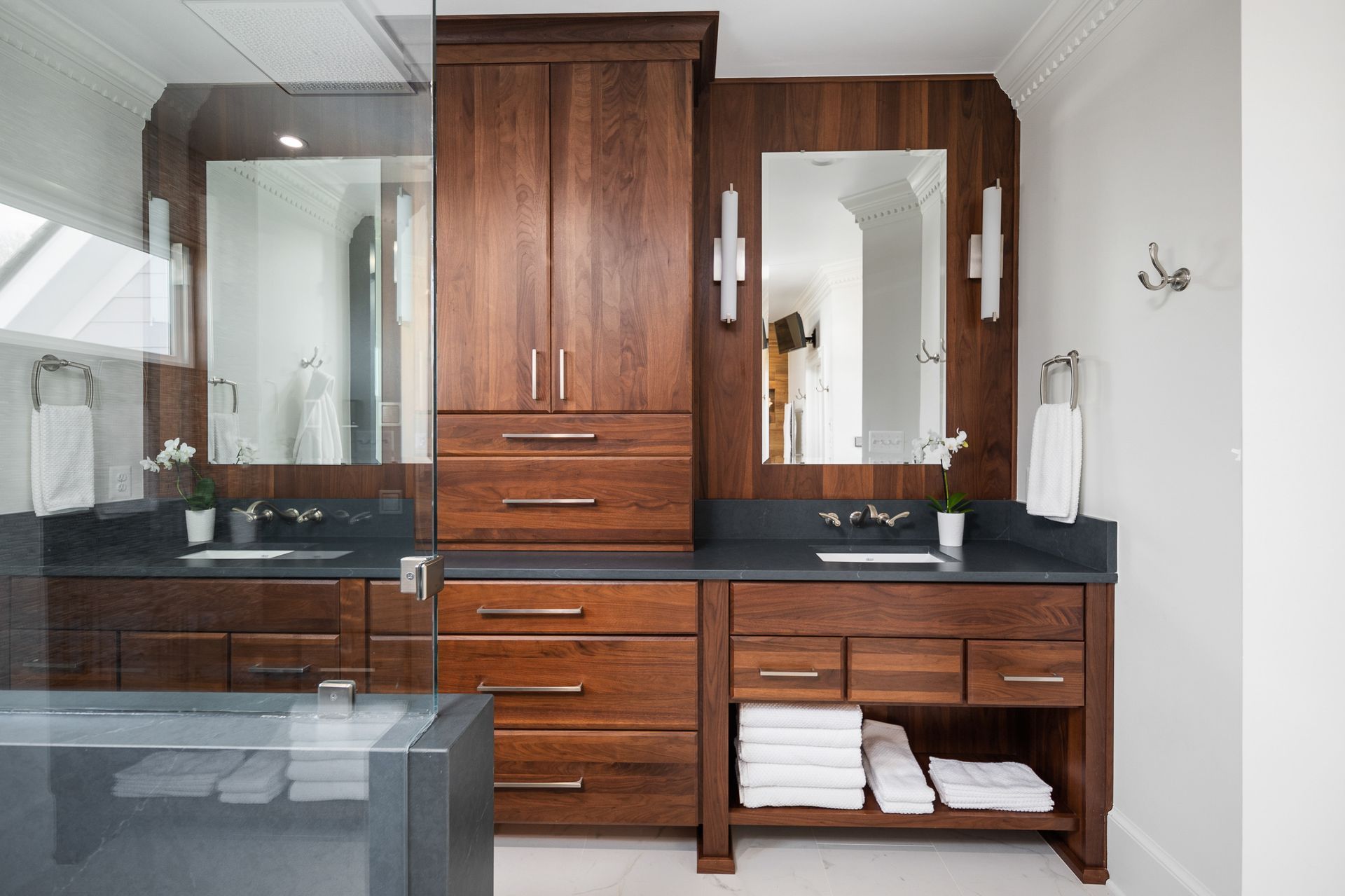 The double vanity is made up of Decora walnut custom cabinetry and a Silestone "Suede and Volcano" Charcoal Soapstone. With deep center drawers, open shelving and a countertop reach-in, this bathroom has more than enough storage.