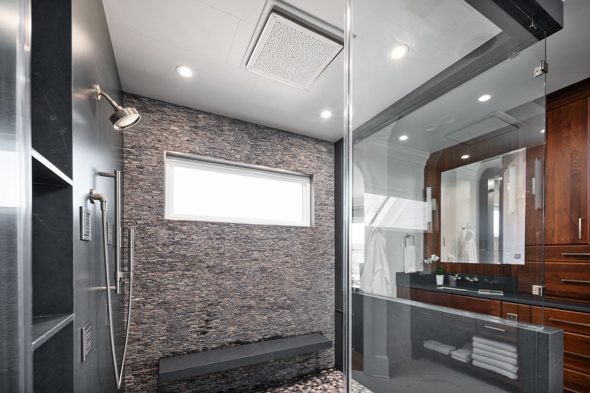 The focal point of the space is the large walk-in steam shower, complete with multiple shower heads, built-in slate bench and storage shelves. Pebble stack-stone on the walls and mosaic tile on the shower pan, all in soothing grey tones, gives the space a natural but modern feel.