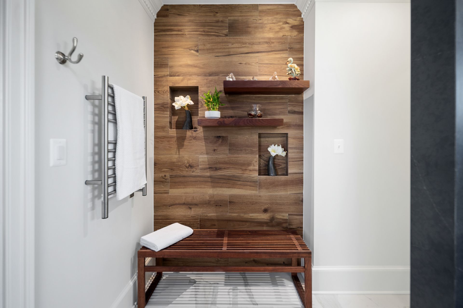 The teak feature wall with built-in shadow boxes, floating shelves and wood bench complete the look of this modern wellness retreat.