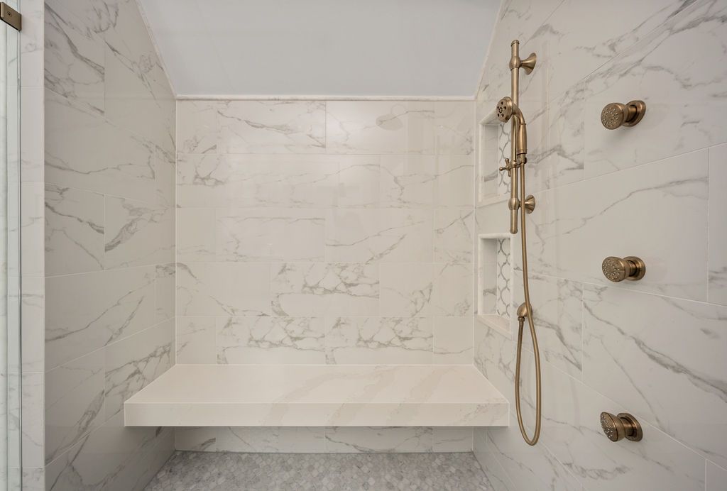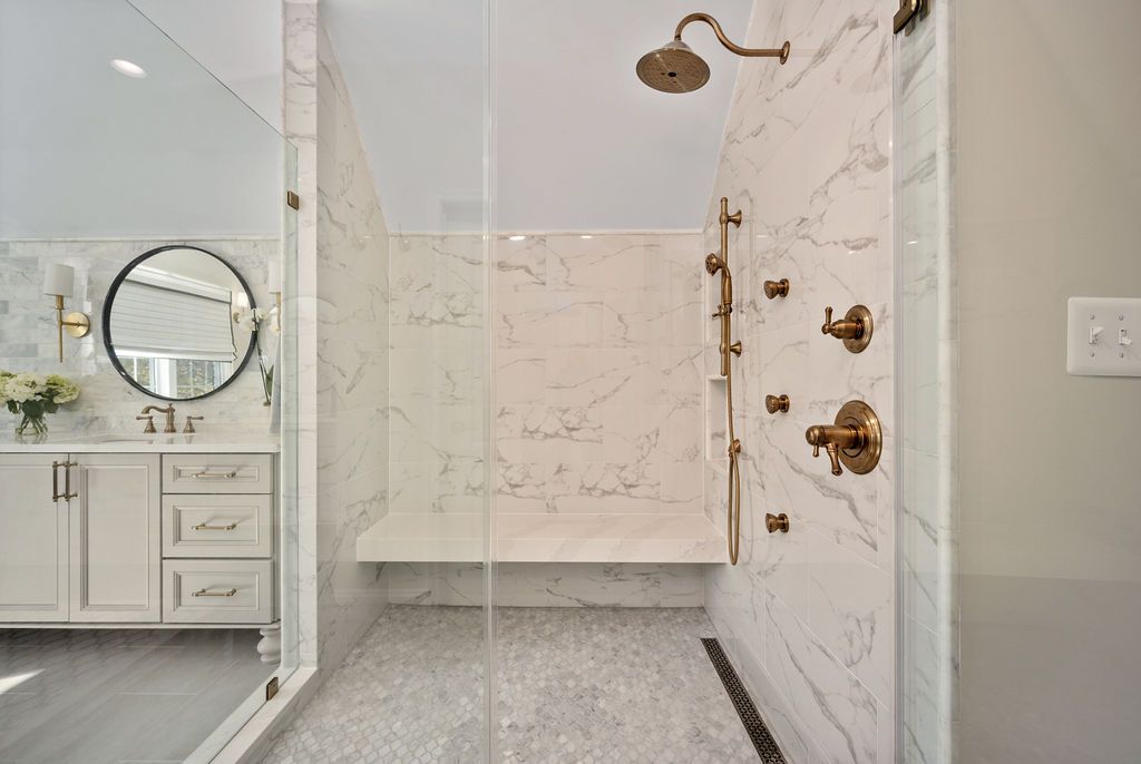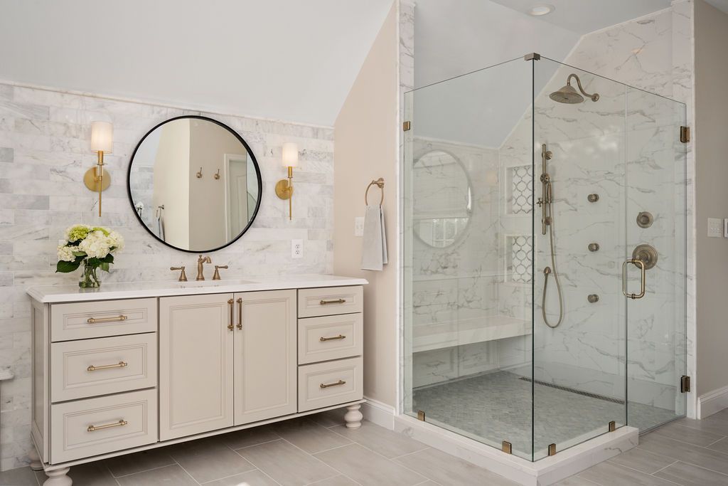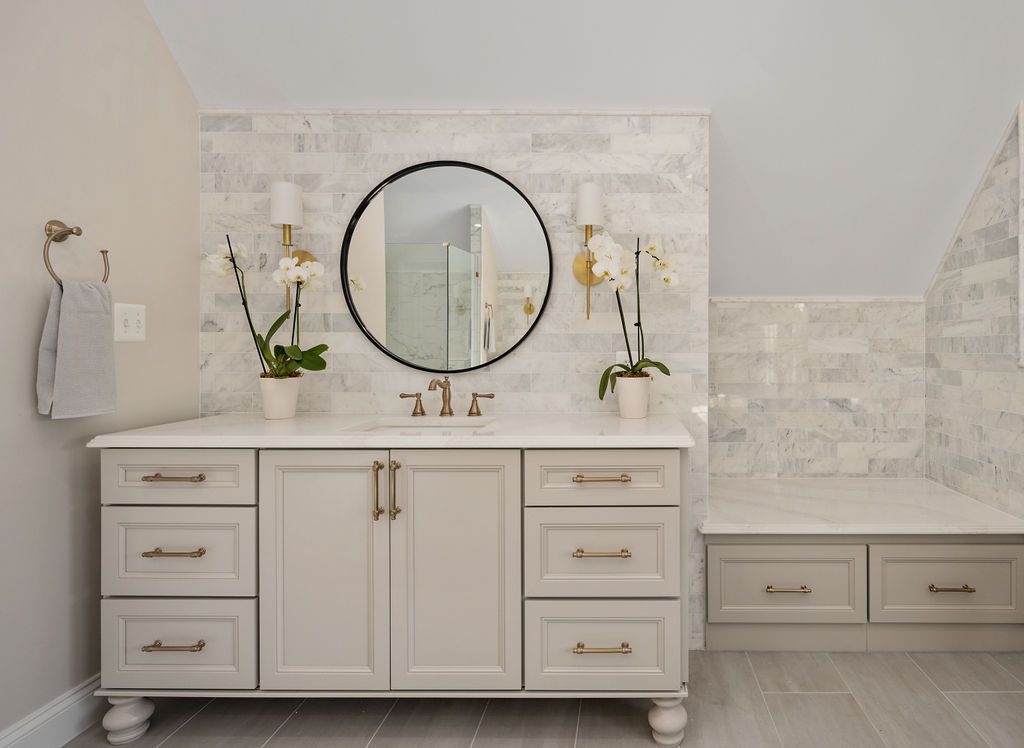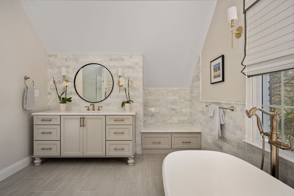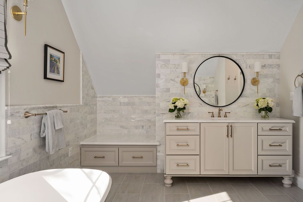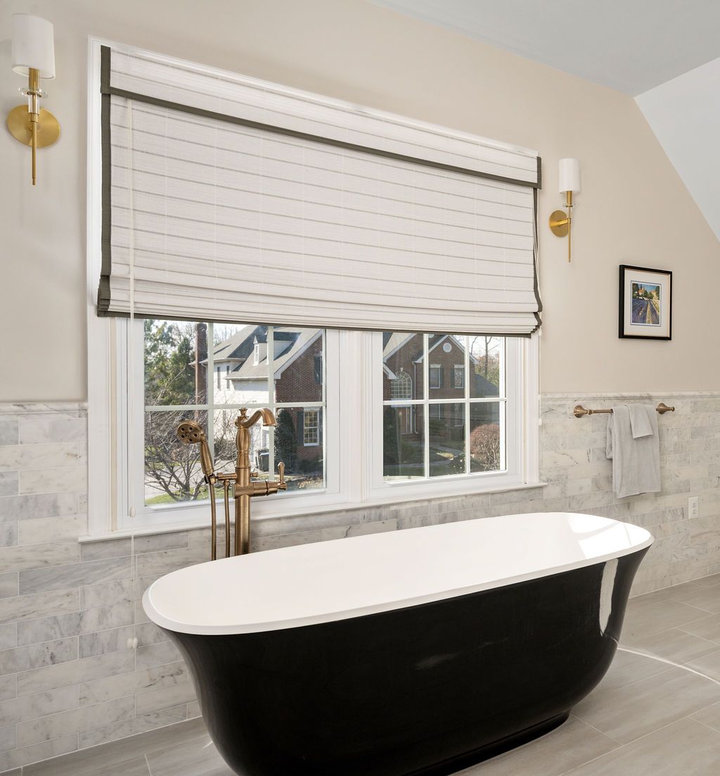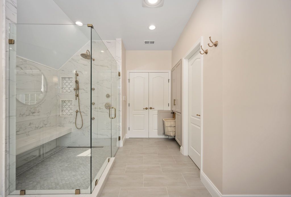 This truly unique bathroom combines luxurious features with functional design. Highlights include the dramatic black statement tub, symmetrical custom vanities, a spacious walk-in shower with multiple showerheads, and a sophisticated mix of metal hardware and fixtures. The final result for this distinctive bathroom is simply stunning.